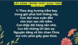 LỜI DÂNG TRONG PHÚT GIAO THỪA Lm. Nguyễn Duy 1/ Theo áng hương trầm bay trong giờ phút linh thiêng này. Con đợi mùa xuân đến cho trọn vẹn nỗi niềm. Con thắp đôi hàng nến nhỏ, kết những lời...